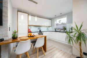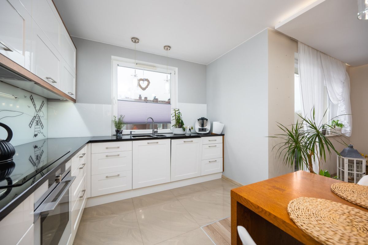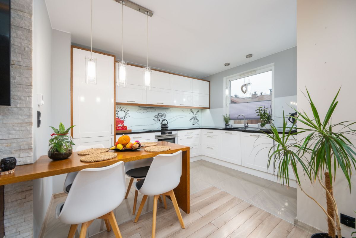 Przestronna, jasna kuchnia z kamiennymi blatami – serce domu, idealne miejsce do spotkań i wspólnego gotowania