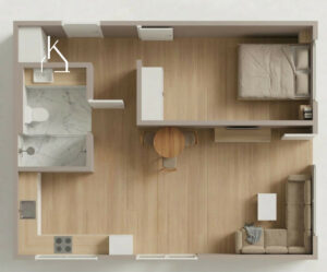 W salonie i sypialni położono panele o najwyższej klasie ścieralności, a w łazience trwały gres – materiały dobrane z myślą o estetyce i funkcjonalności.
