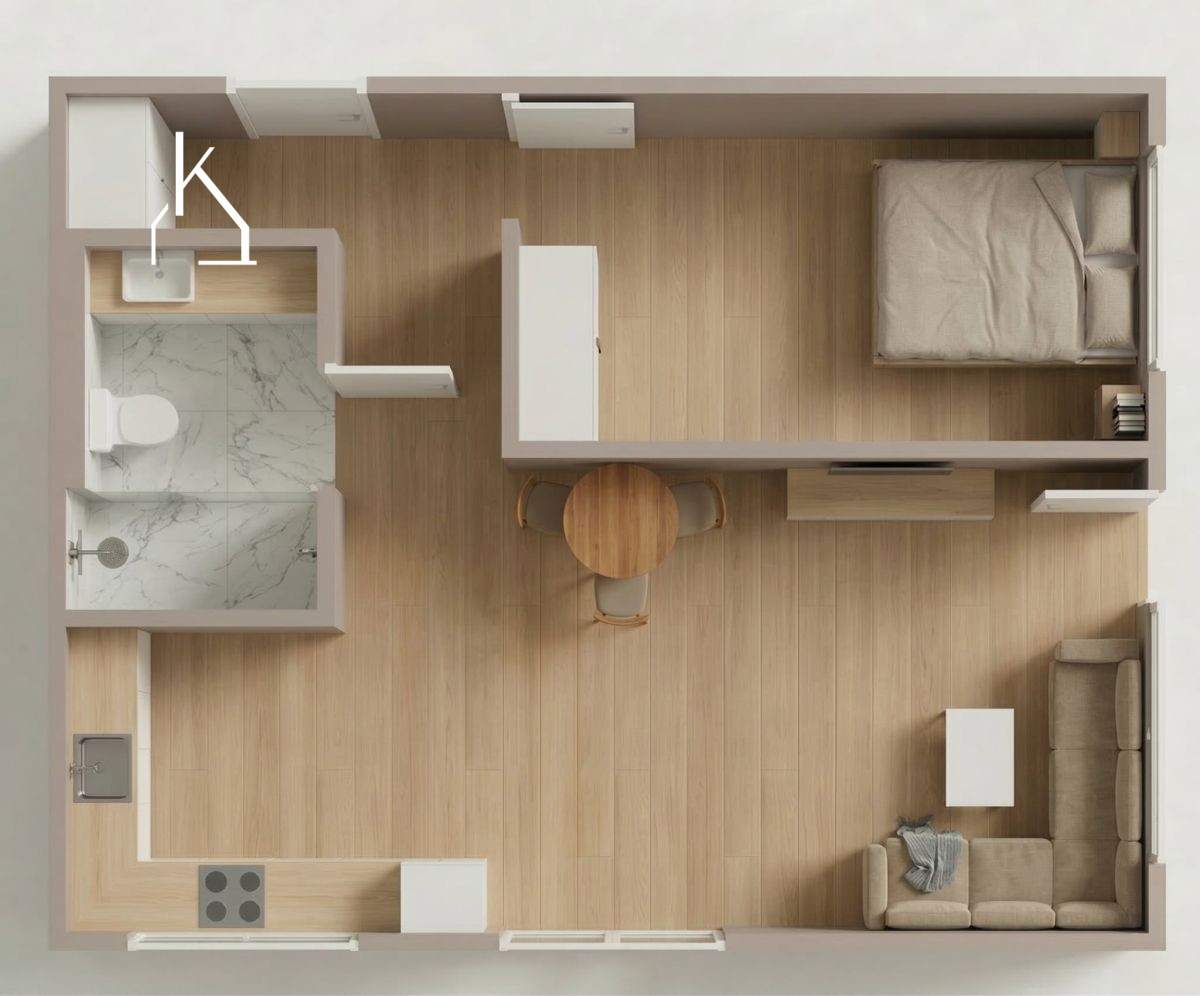 Powierzchnia 35,05 m2 została zaprojektowana tak, aby maksymalnie wykorzystać przestrzeń: