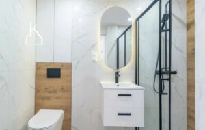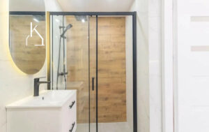 * Łazienka z kabiną prysznicową, wykończona eleganckim gresem