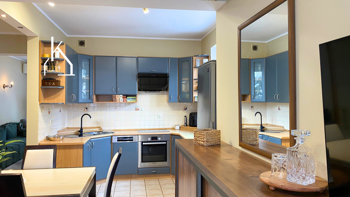 Kuchnia jest w pełni wyposażona w sprzęt AGD: płytę indukcyjną, zmywarkę, piekarnik marki Bosch oraz lodówkę Sharp.