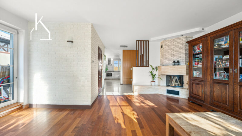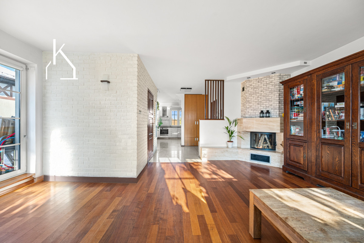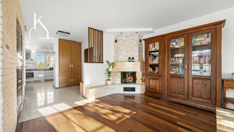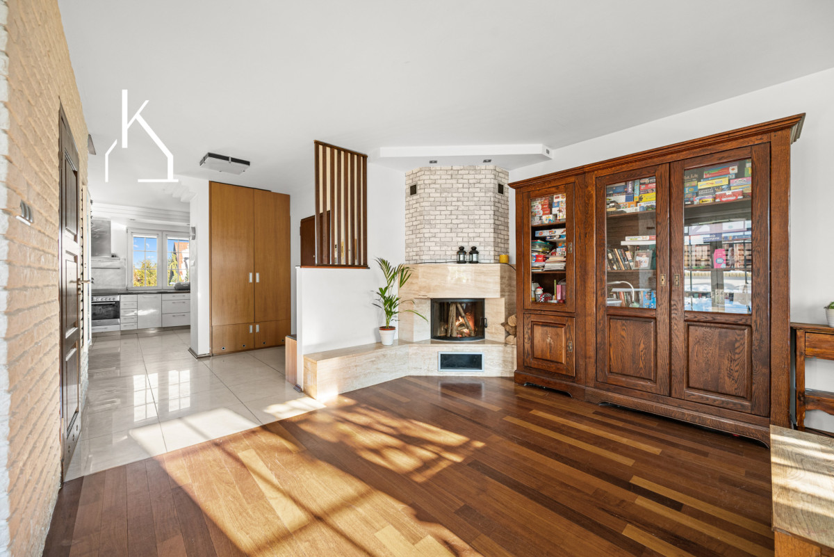 * Salon z kominkiem oraz wyjściem na taras od strony południowej.
