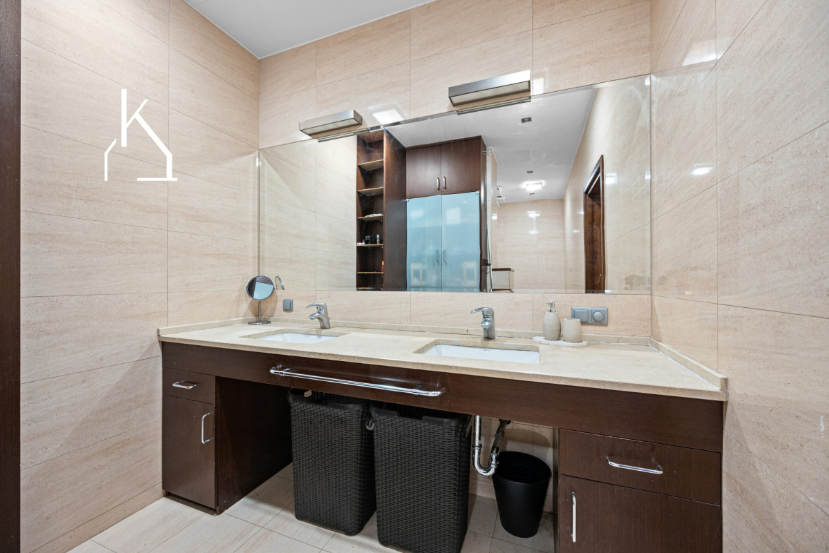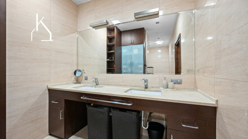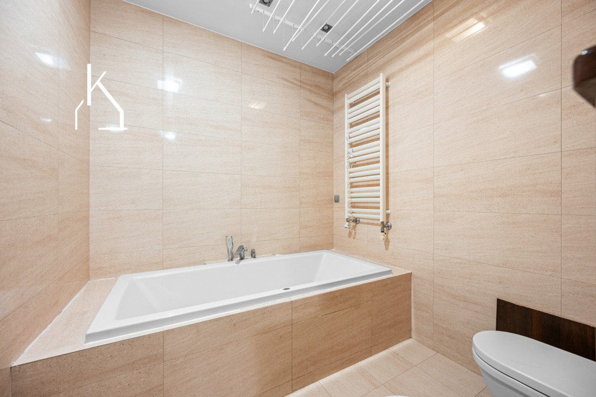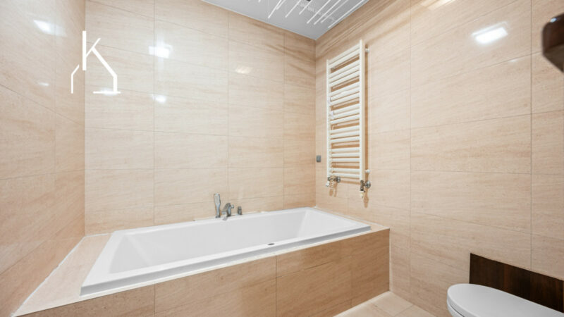 * Pokój kąpielowy z dużą wanną i przestrzenią do przechowywania.
